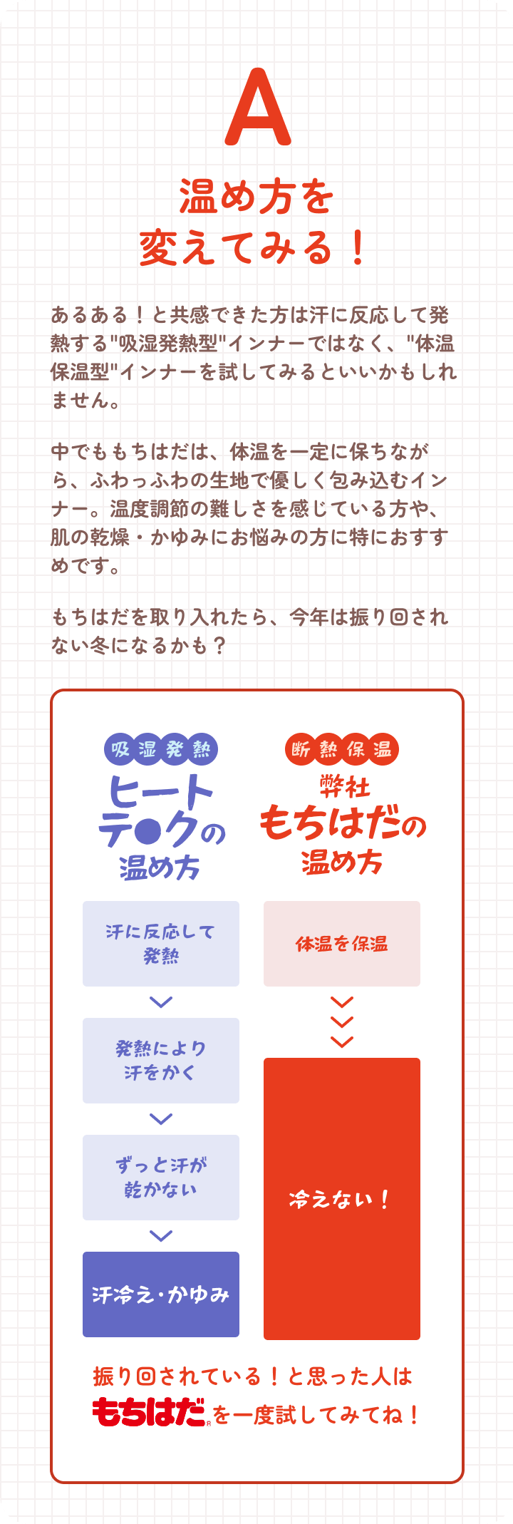 もちはだは吸湿発熱型ではなく、体温保温型のため、発汗サイクルに陥ることはありません。